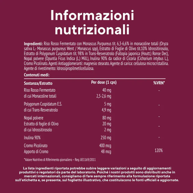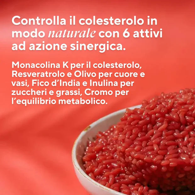 Integratore 100% naturale per il controllo del colesterolo, con Riso Rosso fermentato, Polygonum Cuspidatum, Olivo, Inulina, Opuntia e Cromo Picolinato