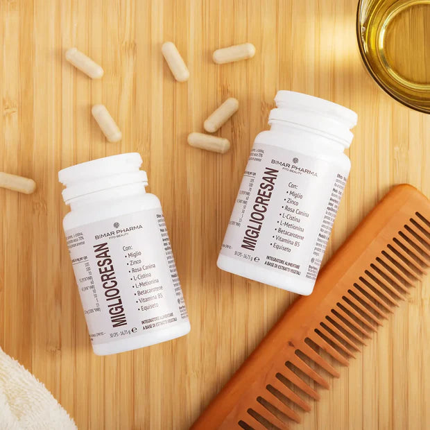 Sviluppato dai nostri laboratori insieme ai professionisti dei saloni per sostenere capelli, unghie e pelle dall'interno. Uno dei motivi più critici per i capelli è il cambio di stagione. Sbalzi ormonali, diete squilibrate, stress quotidiano, smog e agenti esterni lasciano incidono su un bulbo capillare che diventa indebolito. Migliocresan non è un integratore qualsiasi ma un integrazione completa che nasce dal mondo dei saloni e degli istituti di bellezza. Dentro ogni capsula di Migliocresan c'è una squadra di ingredienti che lavora insieme: Miglio, L-Cistina, L-Metionina, Zinco, Vitamina C, Betacarotene, Equiseto e Vitamina B5. Un solo gesto, tre risultati: capelli, pelle e unghie.