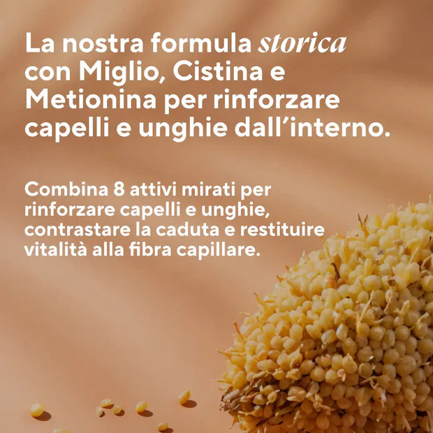 Integratore 100% naturale per rinforzare capelli e unghie fragili, con Miglio, L-Cistina, L-Metionina, Equiseto, Rosa Canina, Vitamina B5, Zinco e Betacarotene.
