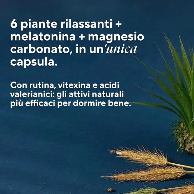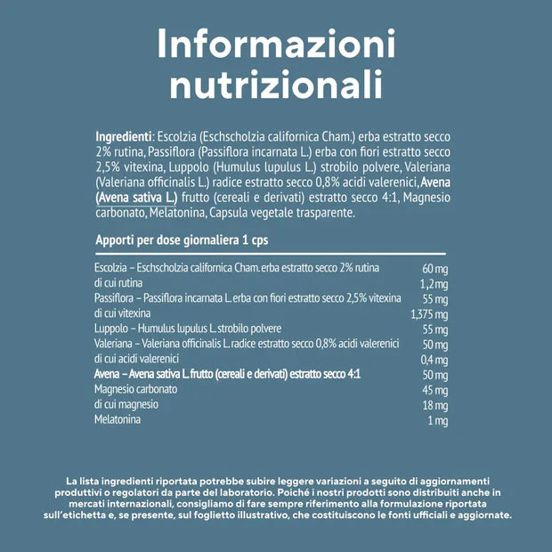 Integratore 100% naturale per favorire il rilassamento e migliorare la qualità del sonno, con Escolzia, Passiflora, Luppolo, Valeriana, Avena, Magnesio e Melatonina.