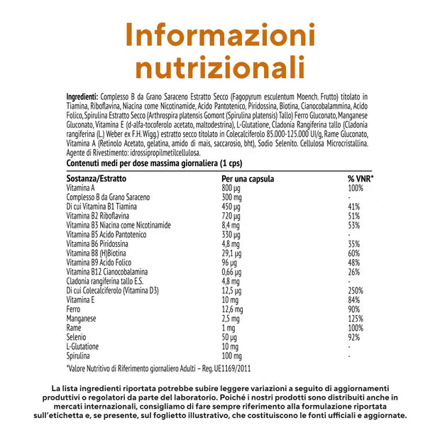 Integratore 100% naturale per energia difese e anti age cellulare con Spirulina, Glutatione, Vitamine del gruppo B da grano saraceno, Vitamina D3, Ferro, Selenio, Manganese, Rame, Vitamine A + E