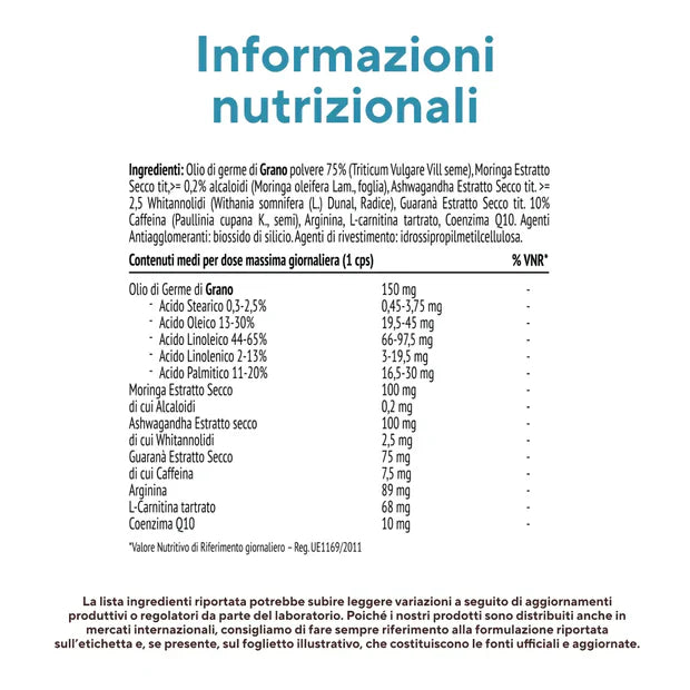 Integratore 100% naturale per energia, metabolismo e supporto alla performance con Moringa, Guaranà, Olio di germe di grano, Withania, Arginina, Carnitina, Coenzima Q10